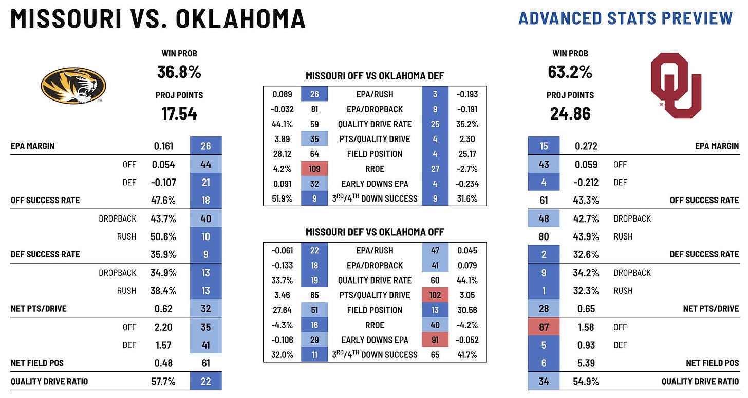 Going to do something I hate doing, and taking an under here. With a total of 42.5, that’s pretty damn low, but the numbers don’t lie. Mizzou has the 6th best rush offense in America, with Ahmad Hardy fresh off a 300 yard performance (yes 300) against Miss State last weekend, leading the charge. They’re struggled throwing the ball since starter Beaux Pribula got hurt 3 weeks ago, but he is now listed as “Probable” to play, which means he’s still hurt but will play. I’m not taking much stock in that, as Mizzou will likely stick with Hardy on the ground. The gameplan for Oklahoma is the same as it’s been all season — lean on this top ranked defense, force turnovers, and be okay enough offensively to win. QB John Mateer still isn’t healthy — at about 82% I’d say — and this offense has struggled in his return. To be honest they’ve struggled since he went down, but they’ve found ways to win. Over his last 5 games, he’s only eclipsed 200 yards passing twice, and has 4 total TDs to 4 INTs, not great. This Mizzou defense is a force up front, and I see it causing all kinds of problems for Mateer. As you can see represented in the matchup graph above, these defenses far outweigh both offenses capabilities. For that, I’ll stick to my guns and take this disgusting under 42.5.