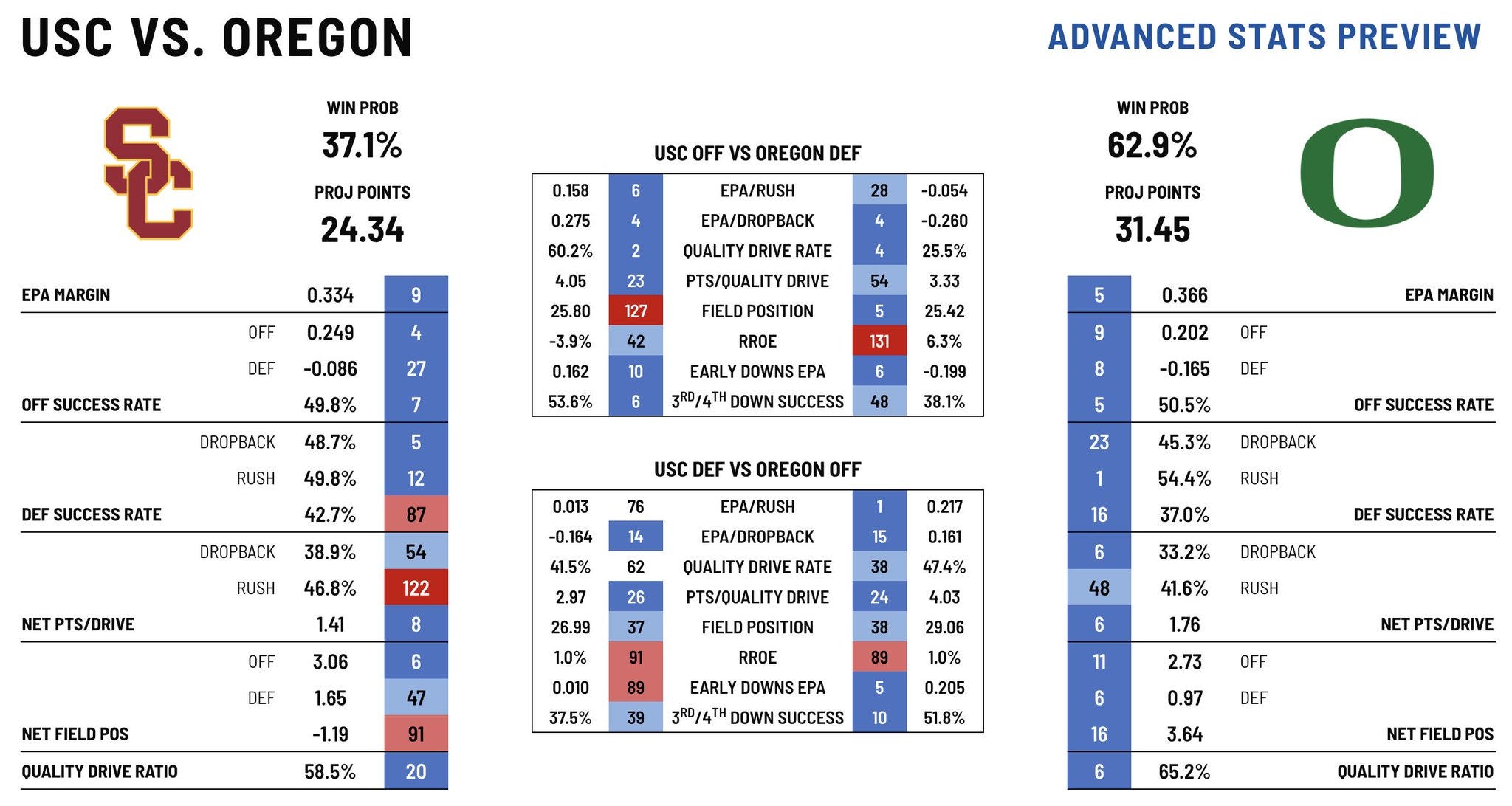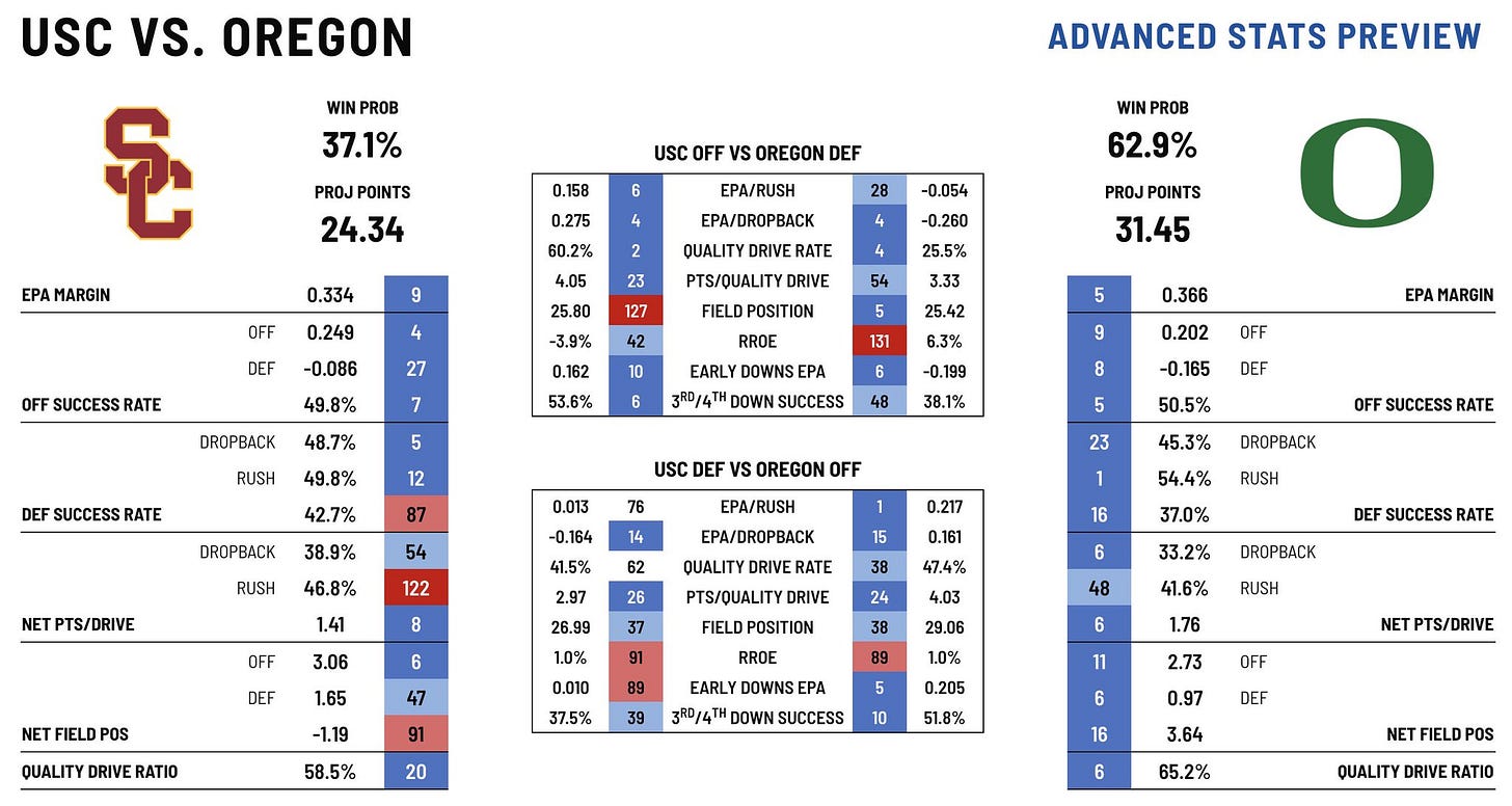 My game of the day right here. If you’re an avid reader, you’ve probably surmised I love QB Jayden Maiava and WR Makai Lemon. For that reason alone, I’ve continued to trust USC in pretty much every spot thus far this season. My Notre Dame friends spite me for this, and rightfully so I suppose, but for the most part they have not let me down. While I think this is one of Lincoln Riley’s best “B1G Ten” modeled teams, I don’t think that’s what they should lean on here. What has saved them this year has been their ability to play dirty, and win ugly (@ Iowa a few weeks ago is a game they usually lose), but what has given them the most success, is that offense. Ranking 3rd in YPG, 5th in points per play, 7th in PPG and 8th in Pass YPG, this is by FAR the best offense Oregon has seen.